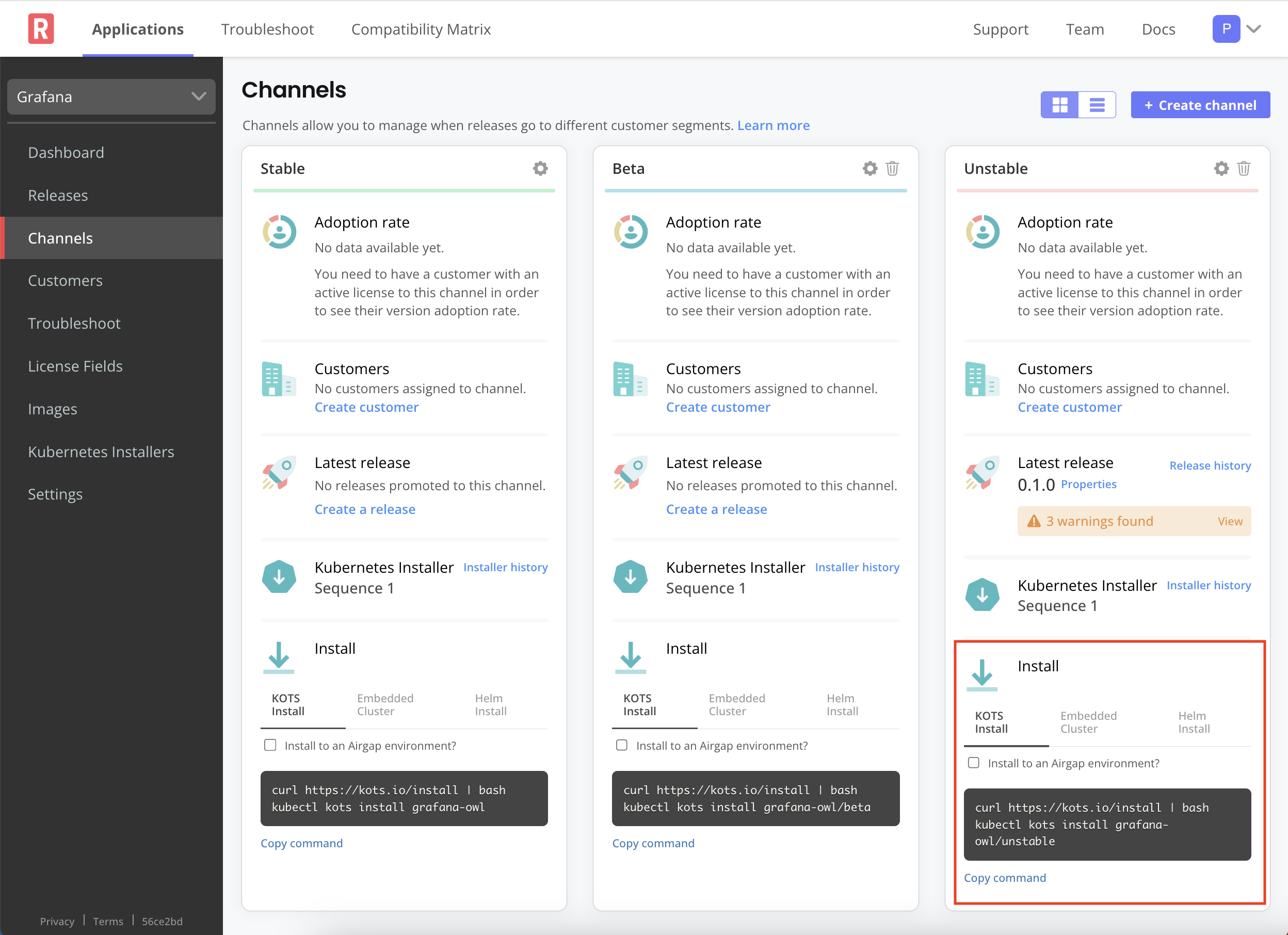 In the Vendor Portal, go to Channels. From the Unstable channel card, under Install, copy the KOTS Install command.